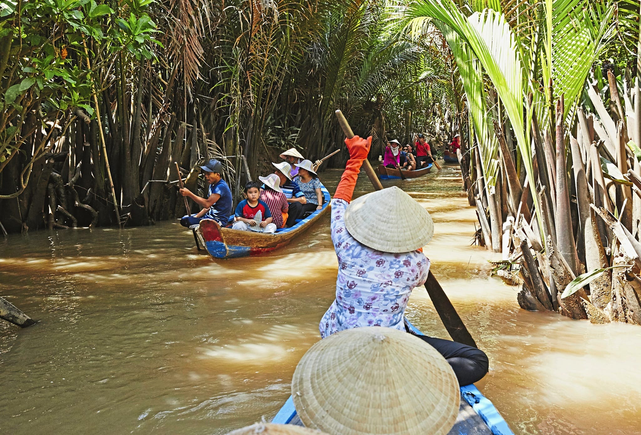Mit einem schmalen Sampan-Boot geht es weiter durch enge, palmengesäumte Kanäle, die von üppiger Vegetation umgeben sind. Diese Fahrt durch das grüne Labyrinth wird Ihnen noch lange in Erinnerung bleiben.