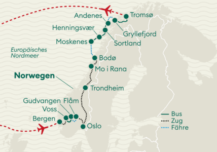 Mit der Dovrebahn legen Sie die Strecke zwischen Oslo und Trondheim zurück. Die Fahrt führt Sie ein erstes Stück in Richtung Norden. Unterwegs durchqueren Sie beeindruckende Landschaften, darunter das bekannte Gudbrandsdalen-Tal und die weitläufige Hochebene Dovrefjell, die mit ihrer ursprünglichen Natur und majestätischen Bergkulisse begeistert.