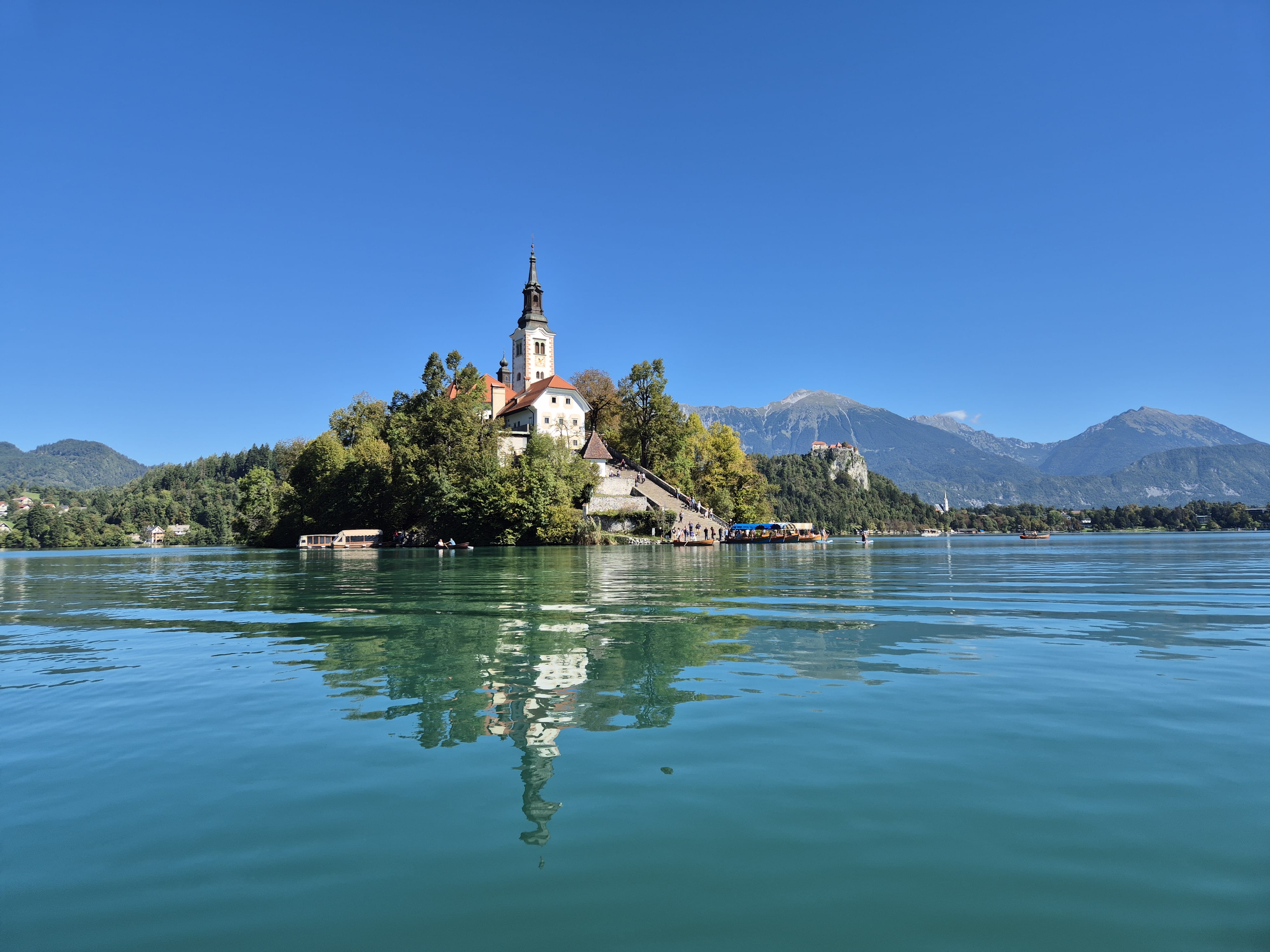 Auf einem traditionellen Pletna-Boot werden wir von einem Schiffer zur idyllischen Bleder Insel gerudert. Der Blick über den funkelnden Bleder See und die eindrucksvolle Bergkulisse ist unvergesslich. Am Mittag darf die Spezialität der Region nicht fehlen: die Bleder Cremeschnitte.